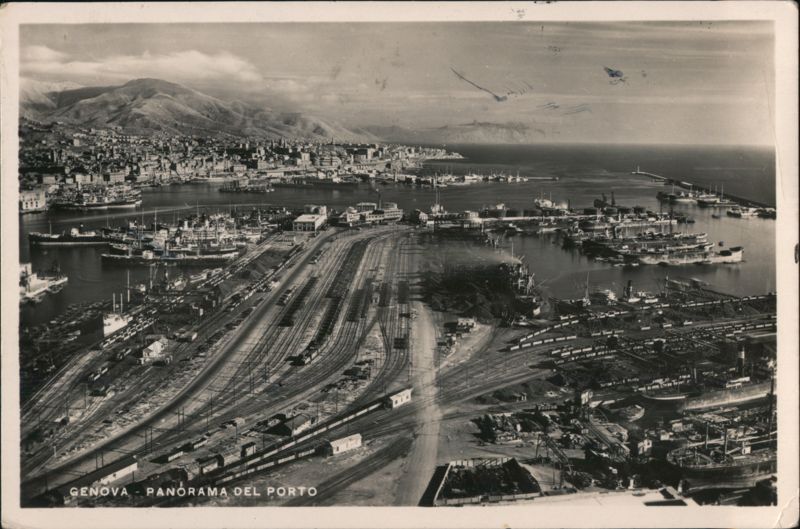 An expansive view of the bustling Port of Genoa, featuring numerous ships docked along the piers, extensive rail lines for freight, and the city extending up the surrounding hills in the background.