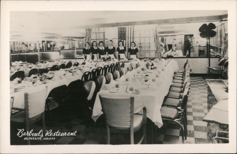 Interior view of Barbouls Restaurant with several female waitstaff members standing in the background. Dining tables are set with place settings, and some patrons are visible at the far end of the room.