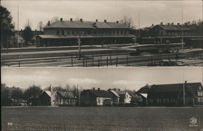 View of the large railway station building and tracks, with a separate view of residential buildings and an open field in Kil.