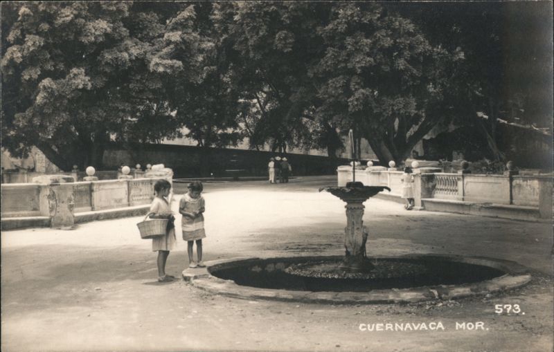 Two young girls stand near a decorative fountain in a park. One girl holds a woven basket. Large trees and a stone railing are visible in the background.