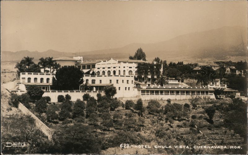 A large hotel complex featuring a multi-story main building with arched windows and a long, lower wing. The hotel is situated on a terraced hillside with lush vegetation and distant mountains.