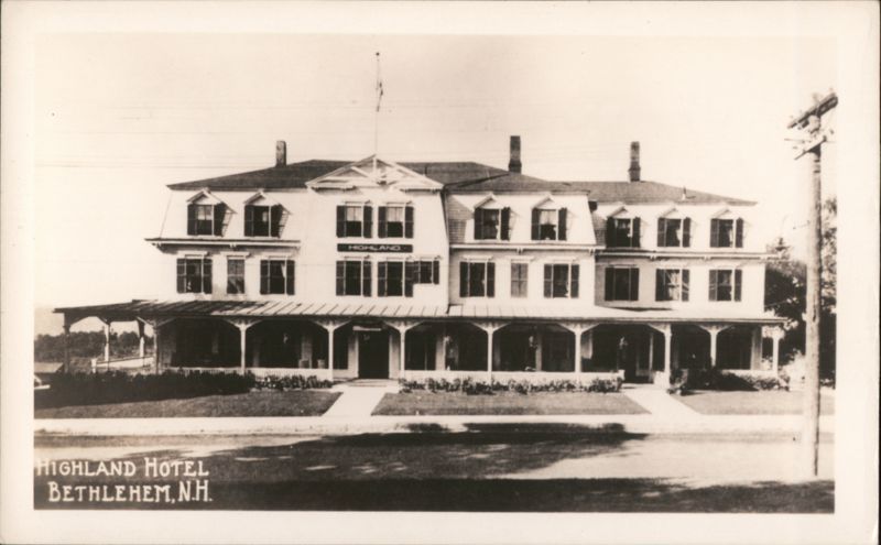 Black and white view of the Highland Hotel, a large multi-story building with a full-length covered porch on the ground floor. A flagpole is visible on the roof.