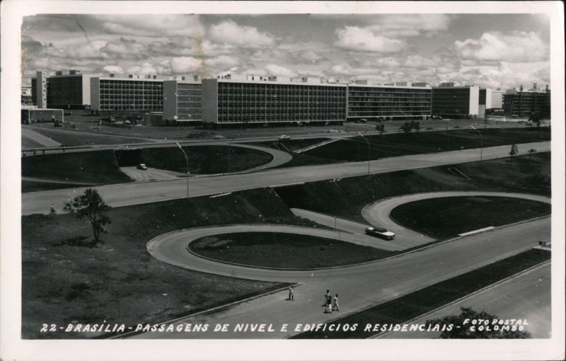 View of large, modernist residential buildings and a complex system of multi-level roads, including loops and underpasses. Brasilia was inaugurated on April 21, 1960, as the capital of Brazil.