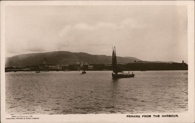 View of Penang from the water, with a sailboat in the foreground and the city buildings and hills in the background.