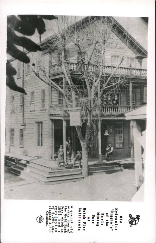 A three-story wooden building with balconies and several people on the porch, located in Dutch Flat, a quaint old mining town from the Gold Rush Days which in 1853 had a population of 6,000 including 1,500 Chinese.