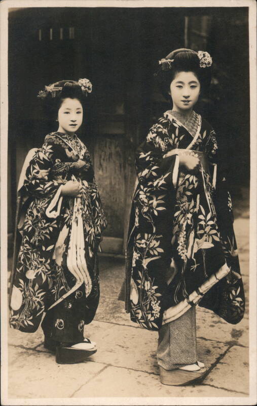 Two young Japanese women standing, dressed in elaborate patterned kimonos, with traditional hairstyles adorned with decorative hairpins and flowers. The woman on the right appears older than the one on the left.