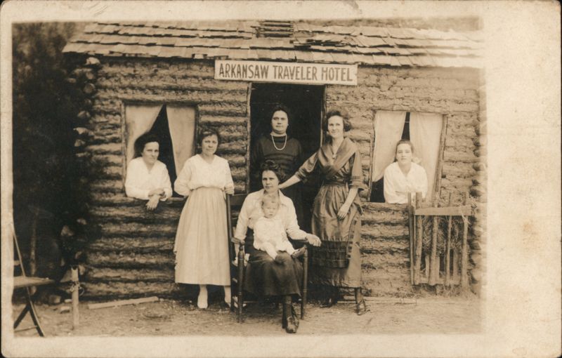 A group of women and a child posed in front of the rustic log cabin style Arkansaw Traveler Hotel. Two women are standing in doorways, two are standing outside, one is seated with a child on her lap.