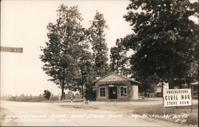 Small stone building identified as an 'Underground Civil War Store Room', located 3.5 miles west of Bentonville on Highway 71. Surrounded by trees and a road in the foreground.