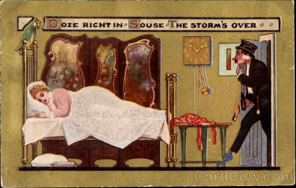 Front: OOZE RICHT IN SOUSE THE STORM'S OVER 0 Back: ON THIS SIDE. A-700 Well how dose this look to looks like asson prite 3 haber, in town sen Monday gobhy you will. Harry & 11 P.M. 1913 Mr Arthur Shand Valentine Hebr.