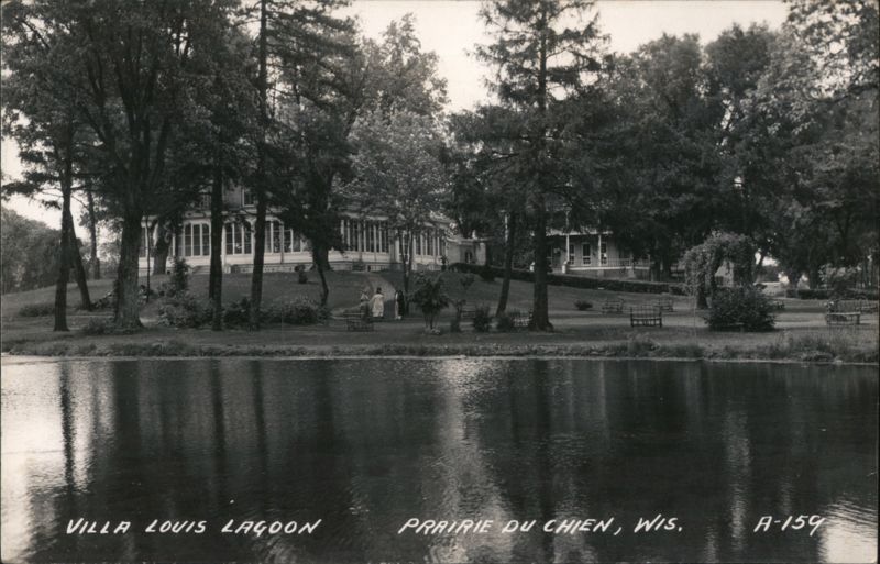 View of the Villa Louis mansion across its lagoon, with surrounding trees and people visible on the grounds.