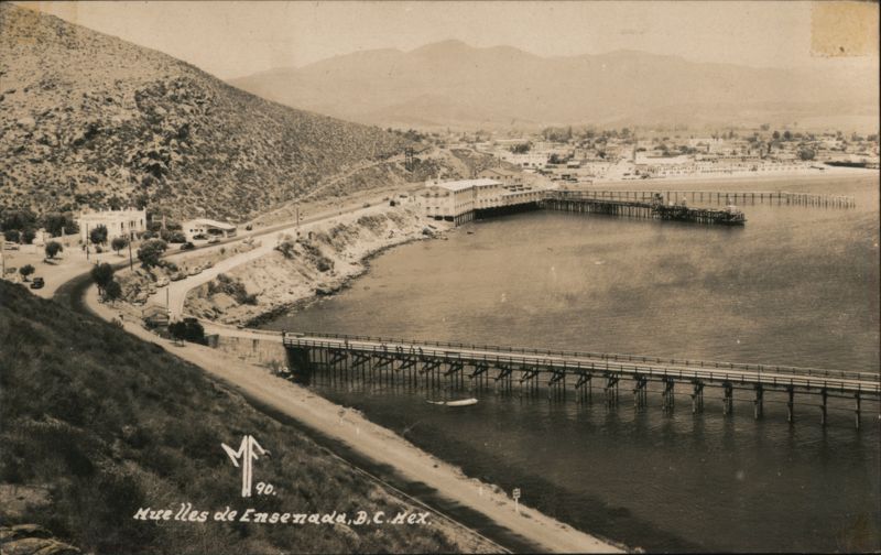 An elevated view of the coastline showcasing a long wooden pier extending into a calm bay. Along the shore, a town with numerous buildings is visible, backed by arid hills.