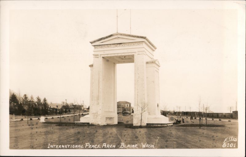 | The International Peace Arch, a large white triumphal arch, stands prominently in a park-like setting. The arch features the inscription 'BRETHREN DWELLING TOGETHER IN UNITY' on its entablature. Trees line the background, and a building is visible beyond the arch. Several small figures are present in the foreground. |