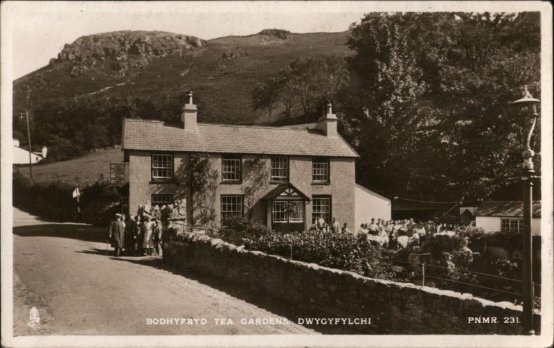 | A large two-story building identified as Bodhyfryd Tea Gardens, featuring a bay window on the ground floor. A stone wall separates the building from a road where people are walking. To the right, a garden area with many people gathered suggests outdoor seating. A steep hill rises in the background, and a large tree is visible on the right. |
