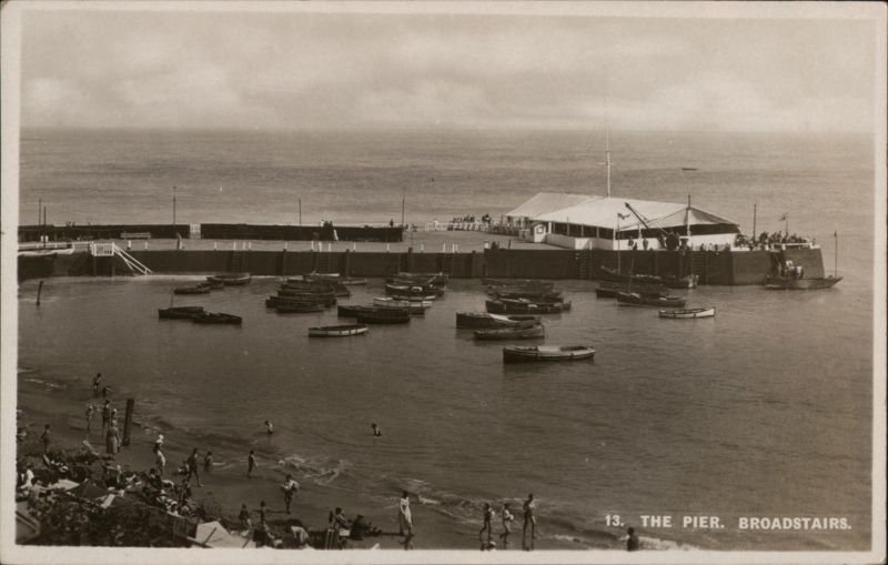 A busy scene at the pier with numerous small boats docked in the water and people strolling on the pier and along the beach. A large building stands on the pier.