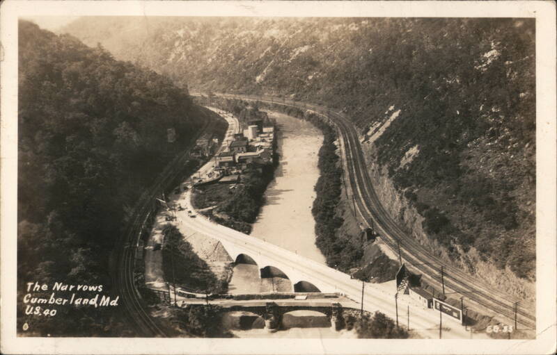 An aerial view of a river winding through a mountainous valley, flanked by a highway (U.S. 40) and multiple sets of train tracks. Structures, including buildings and a bridge, are visible along the riverbank.