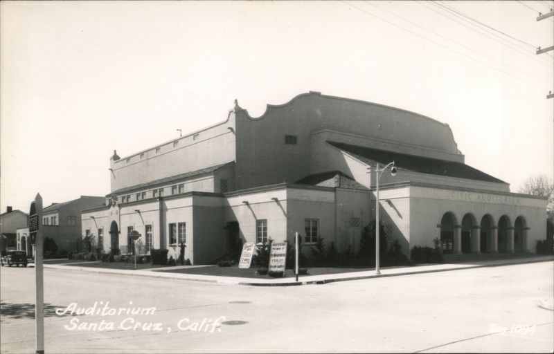 | View of the large, light-colored building with a distinctive curved roofline. The right side of the building features a series of arched entrances labeled 'CIVIC AUDITORIUM'. The building is situated on a street corner with smaller residential buildings visible in the background. |