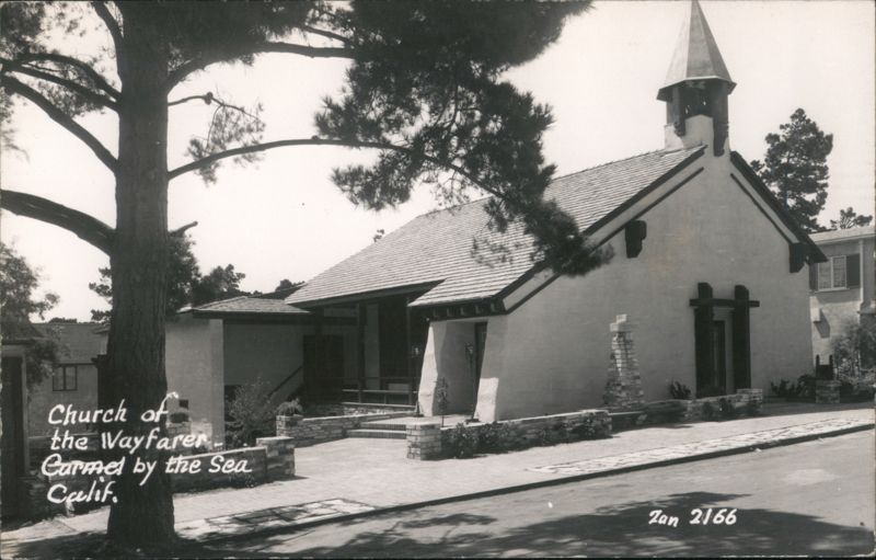 View of the Church of the Wayfarer, featuring its distinctive steeple and the surrounding landscape, including a large tree in the foreground and a street.