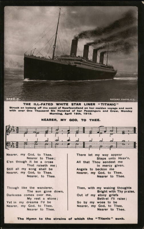 Depicts the ill-fated White Star Liner Titanic, noting its sinking on April 15, 1912, after striking an iceberg. Includes the musical notation and lyrics for the hymn "Nearer, My God, to Thee," stated to be the hymn played as the ship sank.