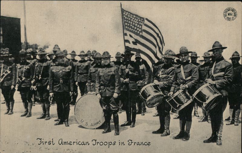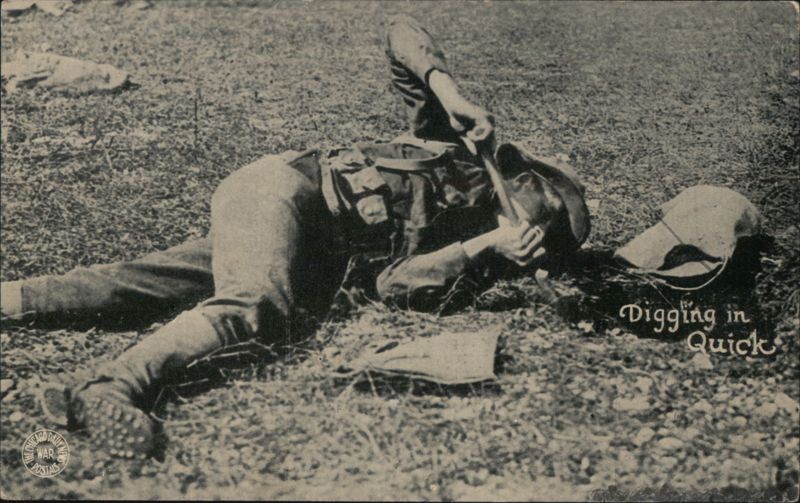 American soldiers in uniform march down a city street in London, led by a large American flag. Spectators line the street on the right. The postcard was produced by The Chicago Daily News War Postal Card Department. WWI Era Soldiers Marching 'Off for the Front' - Military Formation A vast number of uniformed soldiers, armed with rifles, march in long columns, led by officers on horseback. Buildings are visible in the distance, suggesting a military camp or training ground. The scene captures the departure of troops heading to battle. WWI Soldiers Depart for France, Saying Goodbye on Train American soldiers are seen embracing and saying farewell to loved ones, including a young boy, as they board a train marked 'On To FRANCE'. Other soldiers look out from the train windows, depicting a poignant departure scene during World War I. The text 'Good bye "Girlie."' is also visible. Trench Machine Gun Fighting World War I Soldiers Soldiers in a trench operating a machine gun, with several men in military attire surrounding the weapon. US Army Soldiers with Artillery Cannon in Action, WWI Era A group of US Army soldiers operating a large artillery cannon. Several soldiers are positioned around the cannon, with one raising his arm in the air. The scene depicts military training or combat readiness. Soldier Digging In Quick with Entrenching Tool, World War I A black and white image capturing a soldier lying on the ground, using a small entrenching tool to rapidly dig into the earth for cover. His helmet is placed beside him. The scene is captioned "Digging in Quick," illustrating a tactical maneuver during wartime. First American Troops in France with Flag and Drums A formation of US Army soldiers in uniform, some holding drums, with a large American flag prominently displayed. The text indicates these are the first American troops to arrive in France. Engineers on the Hike WWI Soldiers Marching A long column of US Army engineers in uniform, carrying gear, marching along a dirt path next to a grassy hillside. The scene captures military movement during wartime. World War I Rookies Arriving in Camp A group of new military recruits, some in uniform, carrying their luggage as they arrive at a training camp. The scene captures the early days of military service during the war. American Tank in Action with Soldiers in Snow at Camp Dodge, IA A large American tank, possibly a British Mark V, is positioned on a snowy hill, with soldiers in uniform in the foreground and background. Some soldiers are in a trench-like area in the snow. The scene depicts a winter military exercise or training. WWI Soldiers Shaving Outdoors in Camp Dodge, Iowa - 'No hot towels here' A scene showing one soldier lying back in a makeshift chair while another soldier shaves him. They are outdoors in what appears to be a military camp. Other soldiers and military wagons are visible in the background. The text 'No hot towels here' is printed on the front. |