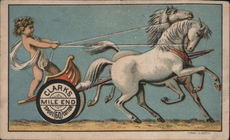 | An advertisement for Clark's Mile-End Spool Cotton, depicting a cherubic child driving a chariot pulled by two white horses. The chariot wheel is labeled 'CLARK'S MILE END SPOOL 60 COTTON'. The reverse side states the cotton is 'the best for sewing machine use' and is 'warranted six-cord'. |