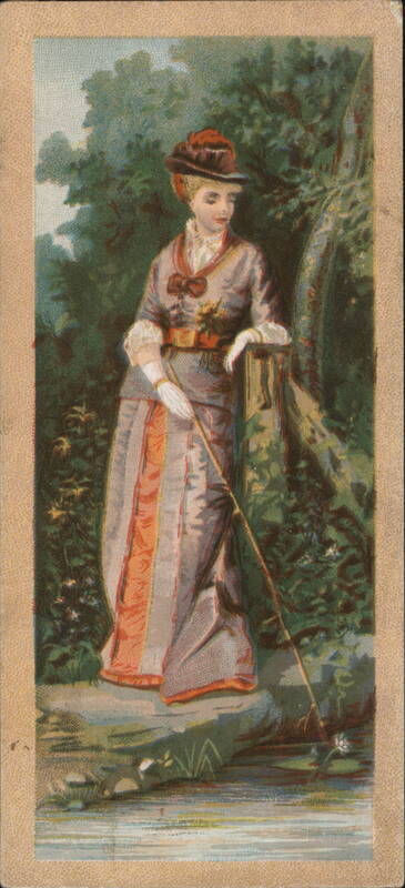 | An illustrated scene of a woman in a brown hat, white gloves, and a long, patterned dress standing on a rock next to a stream, holding a long pole. She appears to be fishing or observing something in the water. The back advertises Moore & Murphy, Manufacturers and Importers of Fine Shoes, located at 136 & 138 Sixth Street, San Francisco, between Natoma and Howard Streets. |
