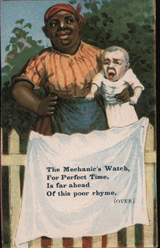 An advertisement for 'The Mechanic's Watch' featuring a smiling Black woman in a headscarf and striped shirt holding a crying white baby, standing behind a picket fence. A cloth draped over the fence displays a rhyme about the watch. The reverse side provides details about the watch's affordability and reliability, stating it costs $7.50 and is designed to put the 'poor working man on an equal footing with the millionaire'.