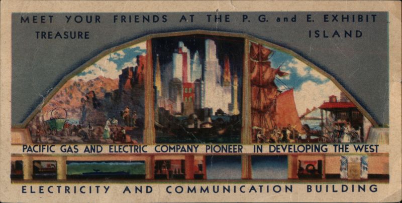 | An arched illustration showcasing the Pacific Gas and Electric Company's exhibit at the Golden Gate International Exposition on Treasure Island. The image depicts three scenes: the pioneering West with covered wagons, a modern city skyline representing development, and a sailing ship, symbolizing PG&E's role as a 'Pioneer in Developing the West'. Below, smaller vignettes suggest interior exhibits of the 'Electricity and Communication Building'. |