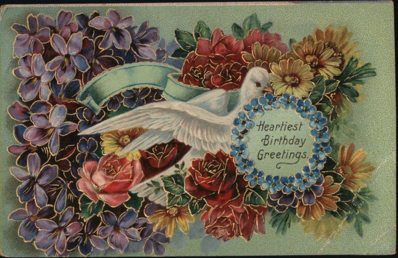 | A white dove in flight surrounded by a vibrant bouquet of red roses, purple and blue pansies, and yellow daisies. A light blue ribbon weaves through the flowers, and a blue floral wreath frames the birthday message. Gold accents highlight some of the flowers. |
