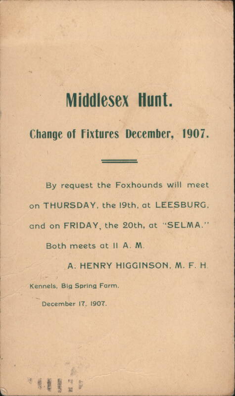 | An announcement card for the Middlesex Hunt, detailing changes to their December 1907 schedule. It states that the foxhounds will meet on Thursday, December 19th, in Leesburg, VA, and on Friday, December 20th, at "Selma," both at 11 A.M. The announcement is signed by A. Henry Higginson, M.F.H., from Kennels, Big Spring Farm. The card was mailed from Leesburg, VA, on December 17, 1907, to Miss Buell in Herndon, VA. |