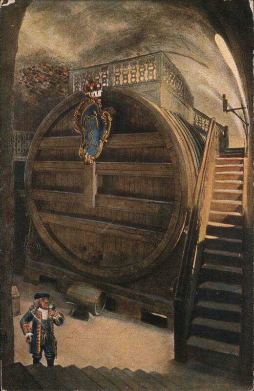 | An illustration depicting the massive Heidelberg Tun wine barrel, capable of holding 212,422 liters, located within a cellar. The legendary dwarf Perkeo, guardian of the barrel, stands in the foreground holding a glass. A staircase provides access to a platform atop the barrel, which features a decorative crest. |