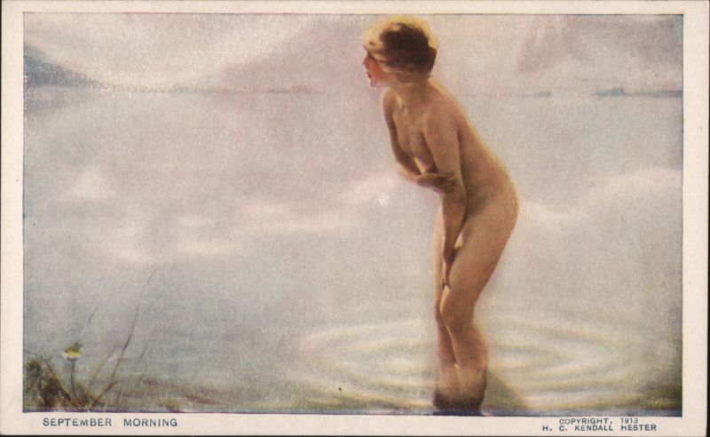 A nude woman stands in shallow water, with ripples around her feet, under a bright, hazy sky.