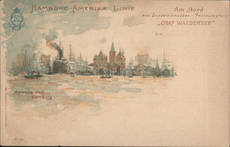 An artistic depiction of the twin-screw mail steamer "Graf Waldersee" in a bustling harbor, with city buildings visible in the background and smaller vessels navigating the waters. The card promotes the Hamburg-America Line.