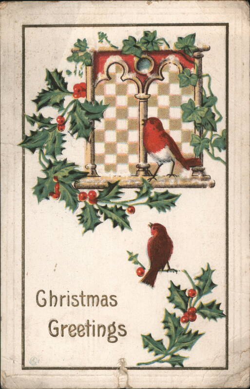 Christmas Greetings with Robbin Birds, Holly, and Gothic Window Illustration