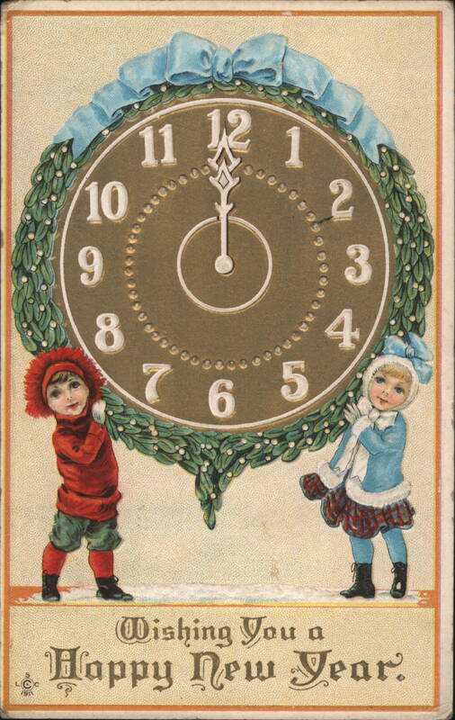 A boy in a red coat and green pants and a girl in a blue coat and plaid skirt hold up a large brown clock face with white numbers. The clock hands are at midnight, surrounded by a green wreath with white berries and a blue bow. The bottom reads "Wishing You a Happy New Year."