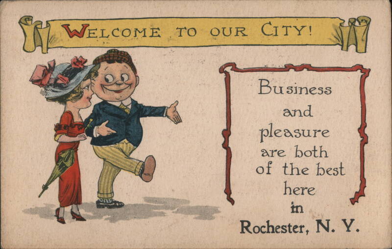 A cheerful cartoon man in a suit and hat gestures welcomingly beside a woman in a dress holding an umbrella. A banner above reads 'WELCOME TO OUR CITY!' and a framed text on the right states 'Business and pleasure are both of the best here in Rochester, N. Y.' |