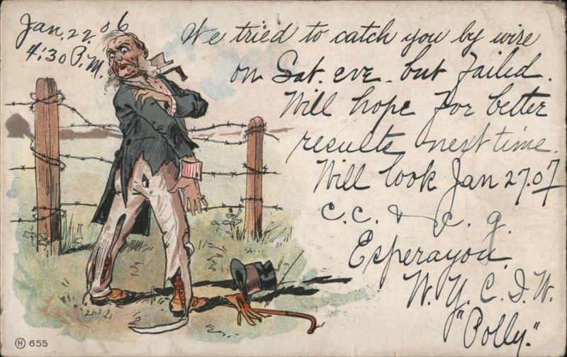 Color illustration of a man with a hammer seemingly stuck in his head, tangled in barbed wire, with his hat and cane on the ground. Handwritten message on the front discusses failing to 'catch you by wire' and hoping for better results. The back is addressed to Mr. Leon Isaac Buckley in Elmira Heights, NY, with a Canton, PA postmark from January 22, 1906. |