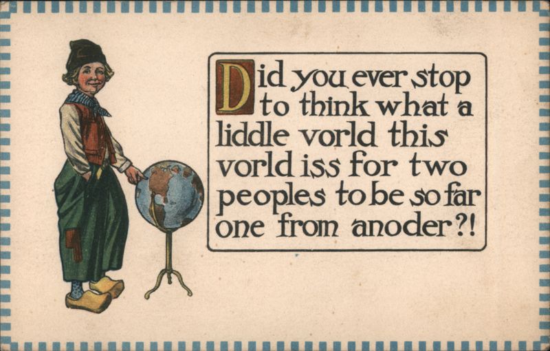 | A young boy dressed in traditional Dutch clothing, including wooden clogs, stands beside a globe, pointing at it. Adjacent to him is a framed block of text with a large decorative 'D', which reads, "Did you ever stop to think what a liddle vorld this vorld iss for two peoples to be so far one from anoder?!" The spelling suggests a humorous representation of a Dutch accent. |