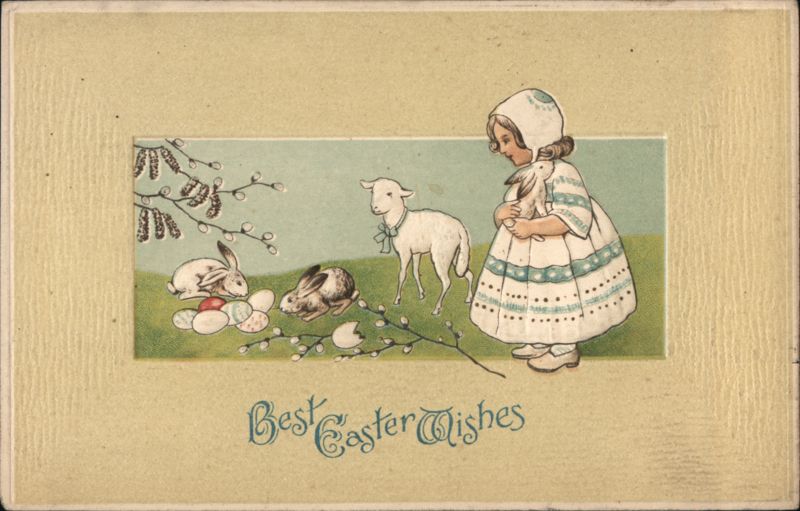 Girl with Bunnies, Lamb, and Easter Eggs, Best Easter Wishes