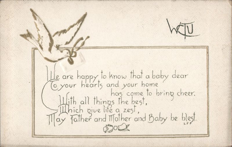 The front features a hand-drawn illustration of a stork carrying a baby, accompanying a poetic greeting for a new baby. The poem reads: "We are happy to know that a baby dear / To your hearts and your home / has come to bring cheer. / With all things the best, / Which give life a zest, / May Father and Mother and Baby be blest." Initials "L.F.P." are at the bottom right of the poem box, and "W.C.T.U." is handwritten at the top right. The back includes a handwritten New Year's greeting from Lucinda Smith. |