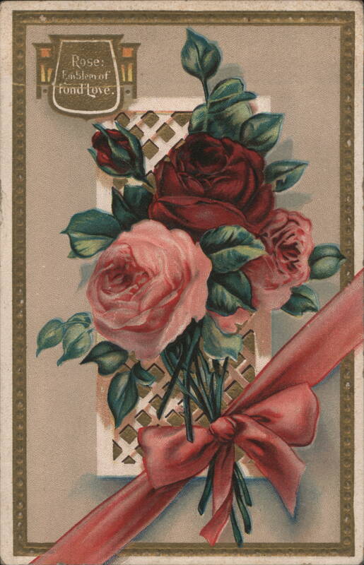 | An illustrated bouquet featuring vibrant pink and deep red roses with green foliage, tied with a flowing red ribbon. The card features the sentiment 'Rose: Emblem of fond Love.' The reverse side serves as an advertisement for 'Friendship Favors Post Cards' by J. A. Everitt, Editor of Up-to-Date Farming, stating there are 50 different designs in the series. |