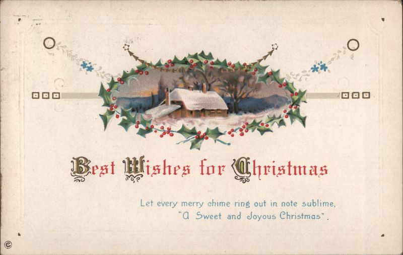 | A festive Christmas greeting card featuring a central vignette of a snow-covered house nestled among trees, framed by a border of holly and red berries. The card includes the sentiment 'Best Wishes for Christmas' and a poem: 'Let every merry chime ring out in note sublime, 'A Sweet and Joyous Christmas''. |
