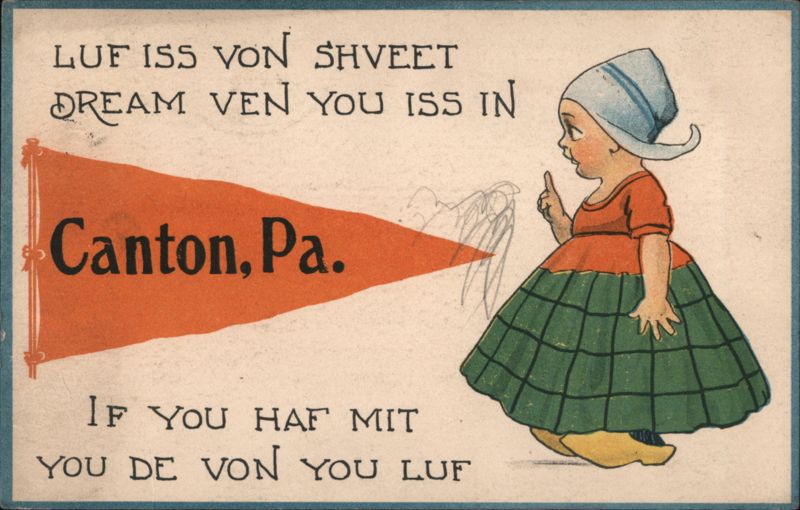 A young girl dressed in a blue bonnet and green plaid skirt points to a red pennant reading 'Canton, Pa.' Above her, text in phonetic Pennsylvania Dutch reads 'LUF ISS VON SHVEET DREAM VEN YOU ISS IN' and below, 'IF YOU HAF MIT YOU DE VON YOU LUF,' translating to 'Love is from sweet dream when you are in Canton, Pa. If you have with you the one you love.' |