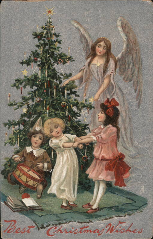 An angel with large wings and a light gown stands beside a Christmas tree, holding a star. Three children are gathered around the tree; a boy in a brown suit plays a drum, and two girls in dresses hold hands and dance. The tree is adorned with candles and ornaments. The card conveys "Best Christmas Wishes."