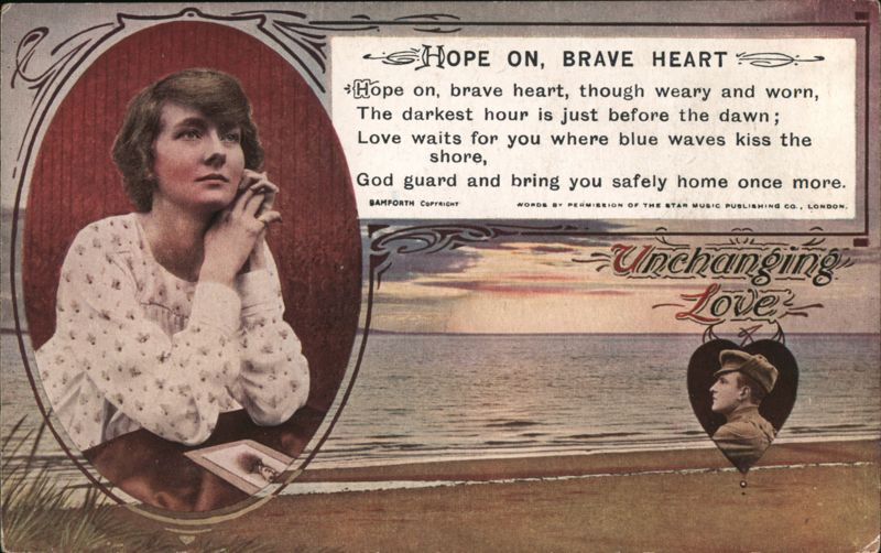 A colorized split-view postcard featuring a pensive woman in an oval frame on the left, and a seascape with a heart-shaped vignette of a soldier in uniform on the right. The card includes the poem "Hope on, brave heart, though weary and worn, The darkest hour is just before the dawn; Love waits for you where blue waves kiss the shore, God guard and bring you safely home once more." The phrase "Unchanging Love" is also present on the right side. The overall theme conveys longing and hope for a soldier's return. |
