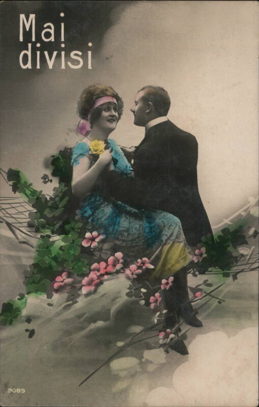 A hand-colored image of a man and woman embracing, seated on a flower-adorned structure. The woman holds a yellow rose, and they gaze into each other's eyes. The text "Mai divisi" is at the top left.