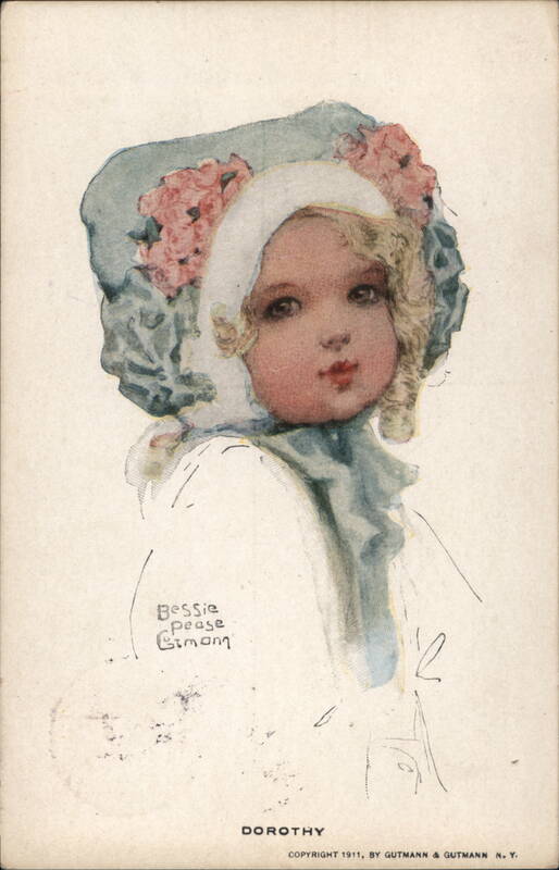 A charming portrait of a young girl named Dorothy, depicted with blonde curly hair, rosy cheeks, and red lips. She wears a white dress and a light blue bonnet adorned with pink roses.