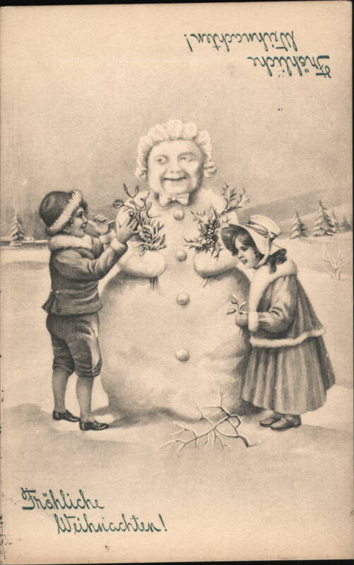 | Two children, a boy and a girl, are depicted in a snowy landscape, decorating a large snowman. The snowman features a distinct human-like face with a bow tie and an elaborate hairstyle or wig. The children are adding sprigs of greenery, possibly holly, to the snowman. Pine trees are visible in the background. |