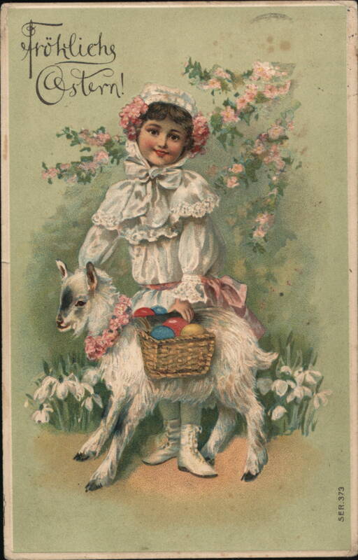 | A young girl in a white dress and bonnet adorned with pink flowers stands beside a white goat. The goat carries a basket filled with colorful Easter eggs. White snowdrop flowers bloom in the foreground, and pink blossoms are on branches in the background. The card bears a 'Happy Easter!' greeting in German. |