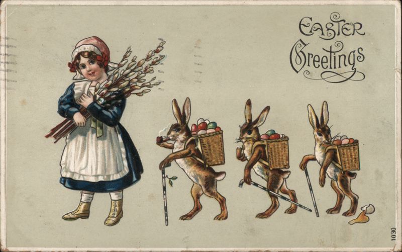 Easter Greetings: Girl with Pussy Willows and Bunnies Carrying Eggs
