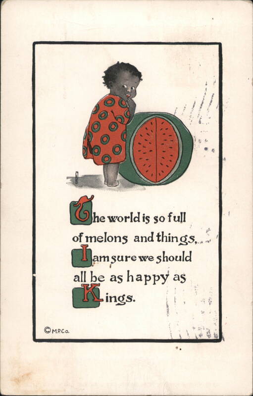 | A young Black child in a red and green patterned dress gazes at a large watermelon. The card features a poem that reads, "The world is so full of melons and things, I am sure we should all be as happy as Kings." The initial letters 'T', 'I', and 'K' are enlarged and stylized. |
